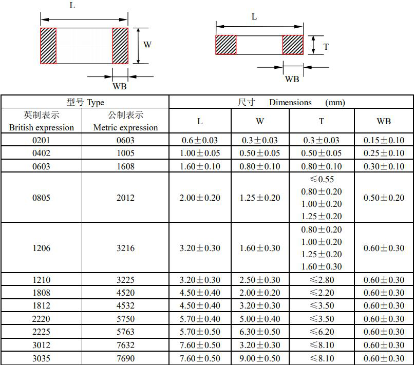 风华MLCC陶瓷贴片电容结构尺寸图如下