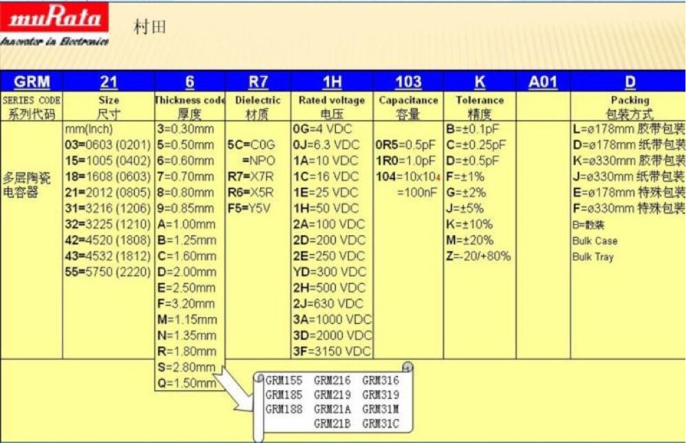 一、GR表示型号:村田贴片电容包含GC,GJ,GM,GQ,GR,KR,LL等