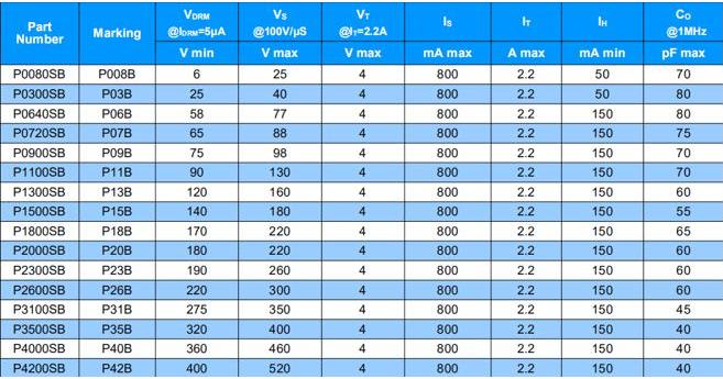 PXXX0SB系列TSS半导体放电气管参数图表如下